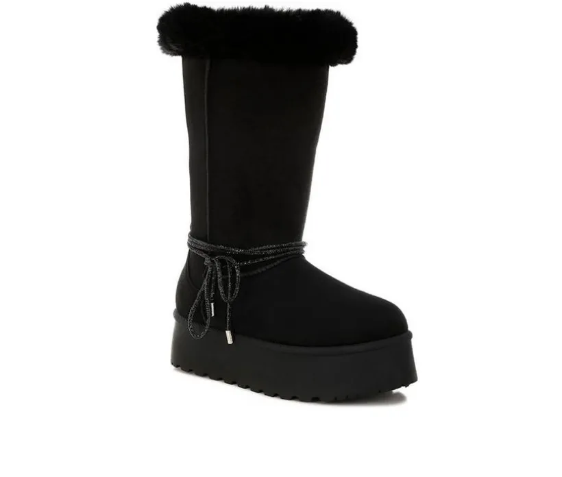 Stay warm and on-trend in these lace-up snow boots featuring a plush faux fur collar and chunky flatform heel. The tall, calf-length shaft ensures coverage and comfort, while the anti-skid outsole gives stability in any winter weather.