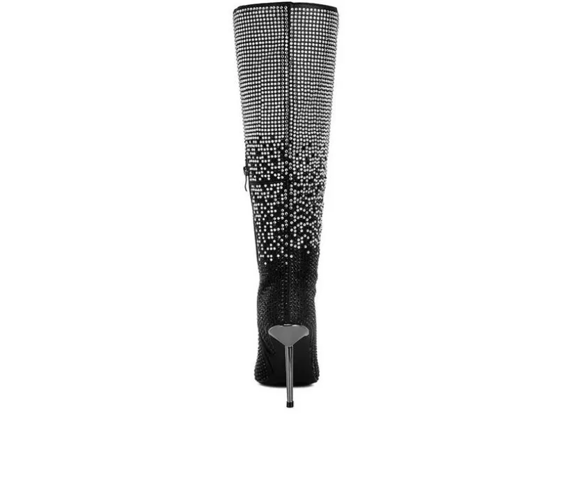 These stunning rhinestone-studded knee-high boots redefine glamour. Featuring a sleek pointed toe, metallic stiletto heel, and side zipper closure, they bring a luxurious touch to any look. Ideal for formal nights or special occasions when you want to shine.