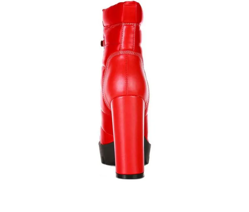 Rich satin Quilted boots with metallic eyelet detail is a bad ass statement biker boot. The high heeled ankle boot has multi panel construction and comes with side zipper opening. The high platform log sole adds to the utility and looks.