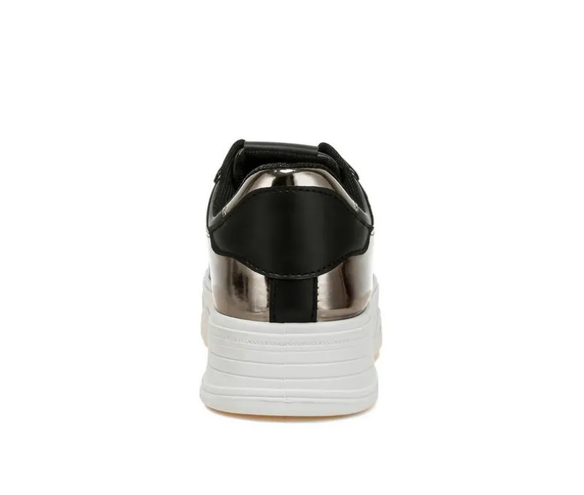 A bold mix of comfort and edge, these faux-leather sneakers pair a chunky flatform with gleaming metallic panels. The lace-up design secures your fit, while a cushioned insole keeps things easy through long days. Finished with a classic round toe and supportive TPR outsole, they add trendy height without the fuss. Wear them to instantly elevate casual looks.