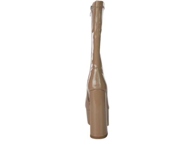 Ultra-High Block Heeled Ankle boot with the raised platform is a straight walk from the ramp! Uber chic, stylish, and statement winter boot. Constructed in patent PU, this has a side zipper opening which makes it easy to wear.