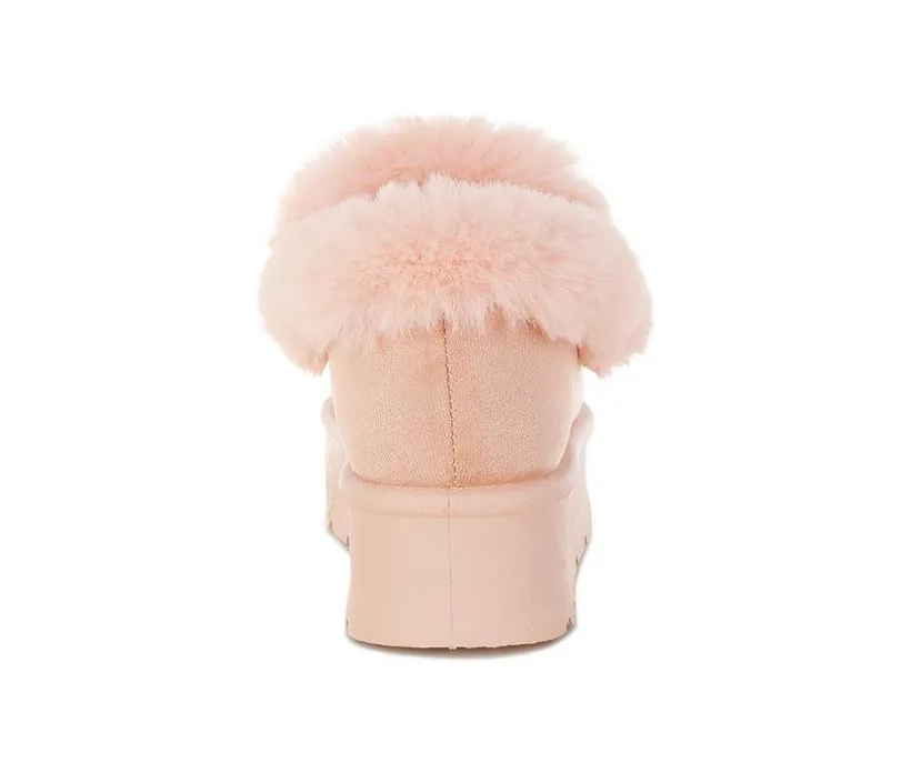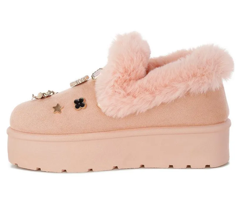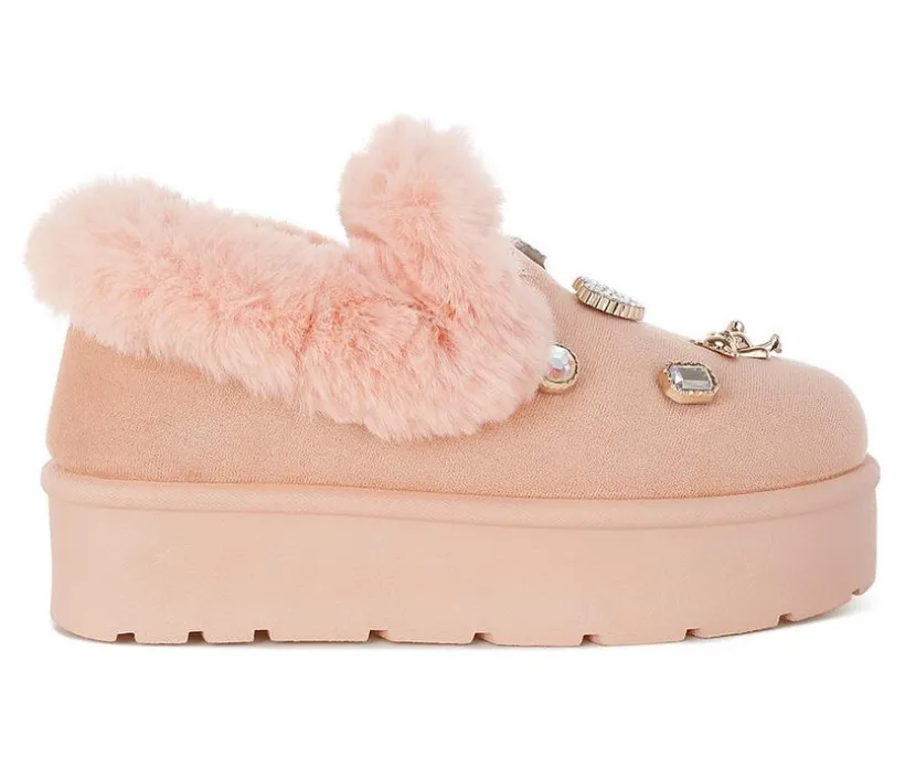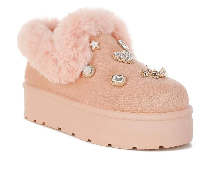 These adorable snow boots are as warm as they are stylish. With a faux fur collar, pearl and rhinestone charms, and a chunky flatform heel, they’re perfect for cozying up in fashion-forward comfort.