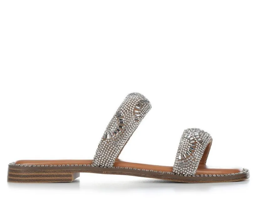 Make every step a statement in the Madden Girl Partly Sandals, where luxe sparkle meets easygoing style. Designed with two thick straps drenched in high-shine crystals—including baguette and round stones in an art deco-inspired wave pattern—these sandals bring bold glamour to casual wear. Perfect for dressing up denim or adding shimmer to a night-out look, they’re all about eye-catching detail and all-day ease.