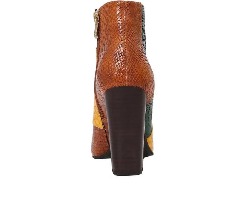Make a statement in these bold ankle boots designed with a sharp, tapered silhouette. The man-made upper features a pointed toe and sleek lines that elongate the leg, while the inside zipper makes them easy to wear. A tall block heel adds dramatic lift, and the short shaft height gives them modern, versatile appeal for pairing with both denim and dresses.