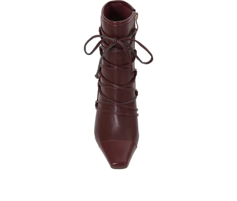 Turn heads in these striking ankle boots that combine bold detailing with sleek design. The man-made upper features a pointed toe and tapered profile for a sharp look, while lace-up styling adds eye-catching flair. A metallic block heel gives a dramatic lift, and the inside zipper ensures easy on and off. Perfect for making a statement with everything from denim to dresses.
