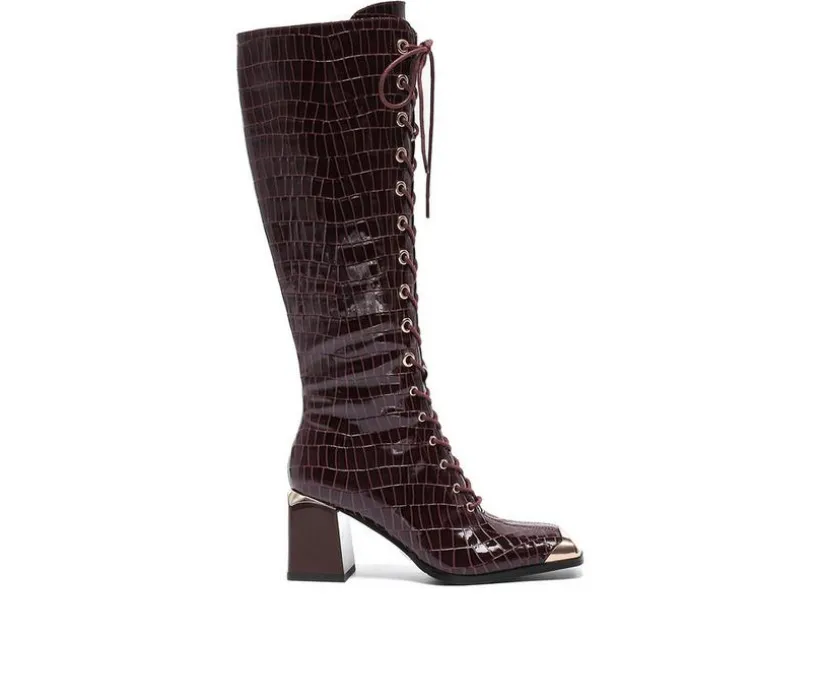 Stand out with these tall boots that combine classic height with bold laced-up styling. The man-made upper rises to just below the knee, detailed with a full lace-up front for striking appeal. A block heel adds a confident lift, while the square-shaped shaft and inside zipper make them easy to wear. A perfect statement piece to pair with dresses, skirts, or skinny jeans.