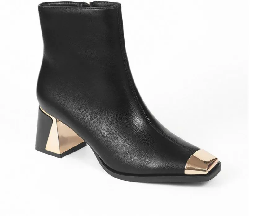 Bring bold style and standout design to your wardrobe with these chic ankle boots. Crafted with a sleek upper and a modern metallic-accented block heel, this pair makes a statement while staying comfortable for everyday wear. The inside zipper allows for quick on-and-off, while the structured silhouette and rounded toe create a polished finish. A cushioned footbed and durable outsole complete the look, giving you fashion and function in every step.