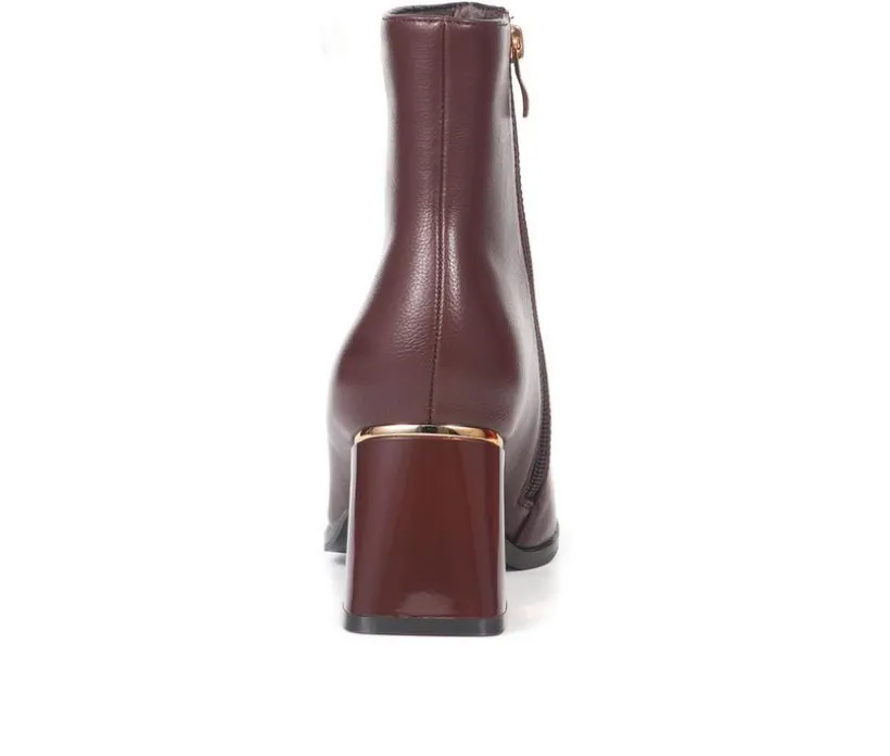 Bring bold style and standout design to your wardrobe with these chic ankle boots. Crafted with a sleek upper and a modern metallic-accented block heel, this pair makes a statement while staying comfortable for everyday wear. The inside zipper allows for quick on-and-off, while the structured silhouette and rounded toe create a polished finish. A cushioned footbed and durable outsole complete the look, giving you fashion and function in every step.