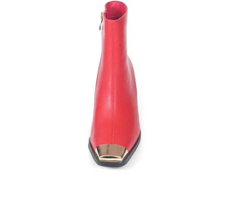 Bring bold style and standout design to your wardrobe with these chic ankle boots. Crafted with a sleek upper and a modern metallic-accented block heel, this pair makes a statement while staying comfortable for everyday wear. The inside zipper allows for quick on-and-off, while the structured silhouette and rounded toe create a polished finish. A cushioned footbed and durable outsole complete the look, giving you fashion and function in every step.