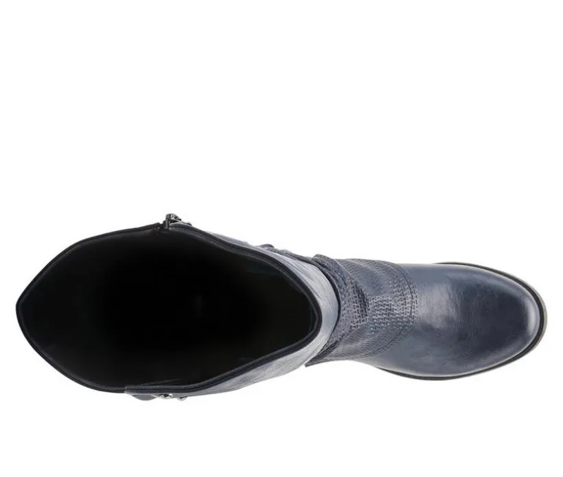 Modern pull-on tall boot featuring embossed patchwork design with a decorative back shaft lacing and an easy on/off inside zipper all on a chunky and sculpted heel.