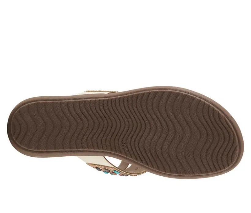 Bring bold personality to casual looks with this colorful thong sandal that blends artisanal flair with laid-back comfort. The synthetic upper features vibrant beadwork and floral accents for standout style, while the toe-post design adds a classic, breezy feel. A lightly contoured footbed supports your stride, and the low-profile wedge offers subtle lift. Ideal for everything from vacation walks to everyday errands, this sandal makes comfort look fun.
