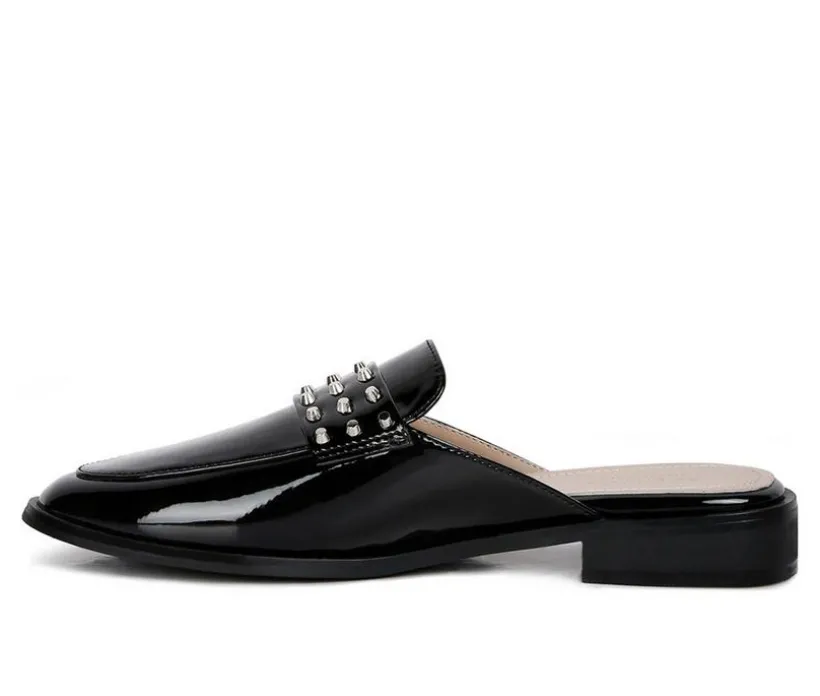 Flat casual mules for women; it has lighlty padded insole which gives ample support. The metal studded detail adds detail to the shiny patent almond toe flats. The low heel is a comfortable semi casual style for all day wear. Type: Mules. Heel Type: Flats. Almond Toe Upper Material: Patent Leatherette. Lining: Soft Leatherette. Outsole: Rubber. Metal Studs. Softly Padded Insole. Semi Casual Flats for Women. RCSH4052.