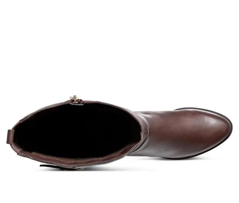 Knee High Leather Boots with a comfortable low block heel, instep zipper opening for easy entry, and buckle strap details for added fashion.