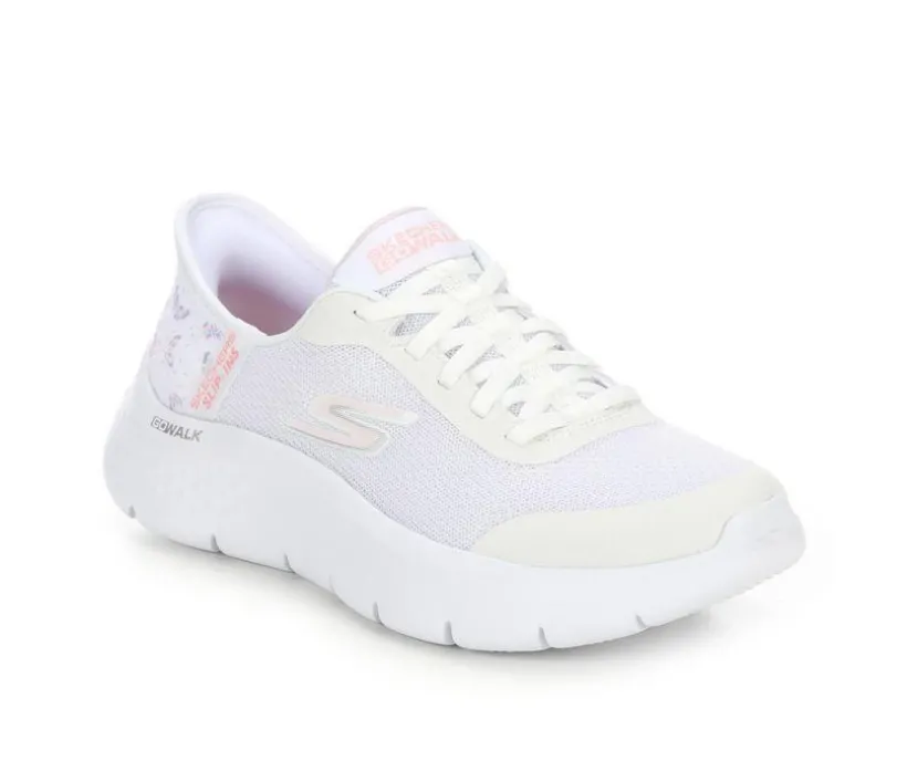 Step-in to convenient walking comfort and cushioning wearing Skechers Hands Free Slip-ins® GO WALK® Flex. Designed with Heel Pillow™, this sporty style features an athletic mesh upper with stretch laces, floral print trim, Skechers Air-Cooled Memory Foam® insole, lightweight ULTRA GO® cushioning, and Flex Pillars™ for added support.