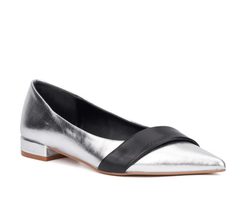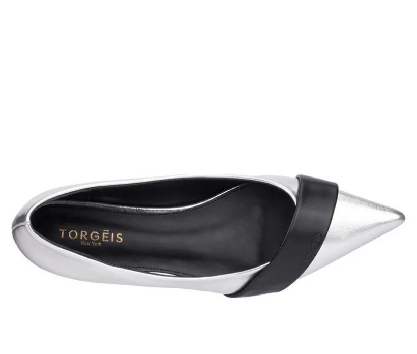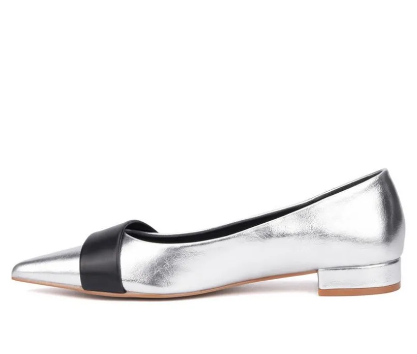 These pointed-toe flats offer a sleek and sophisticated look with a hint of shine. Featuring a low block heel and bold contrast band across the vamp, they bring a modern edge to a classic silhouette. Ideal for office wear, events, or elevating everyday outfits, they combine comfort and style in one effortless design.