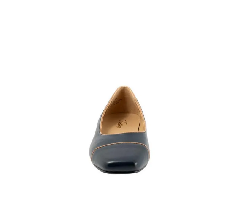 Harbor makes a statement with its square toe and skimmer style and delicate piping detail. A wonderfully cushioned footbed and flexible rubber sole with low stacked heel finish off this beautiful flat.