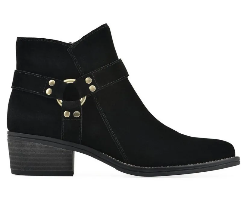 Strut in the modern western style of the Altossa bootie from White Mountain Shoes. This bootie is ankle length with a functional inside zipper for easy closure. The harness detailing provides a modern look on a western style bootie.